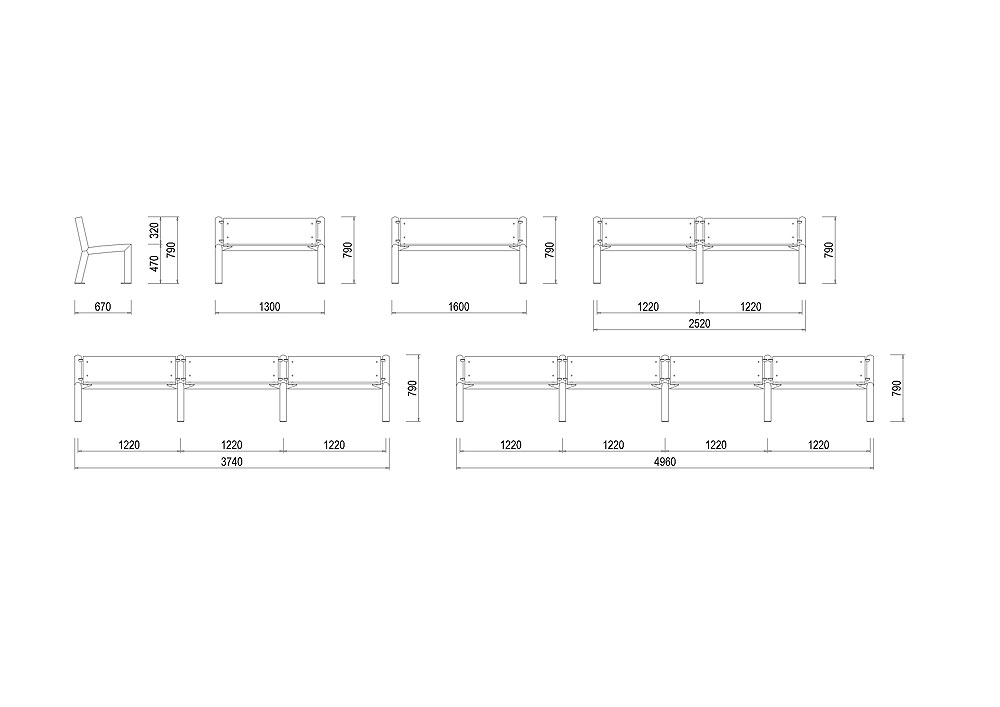 Lavička E-LA02 je dostupná ve dvojím provedení a to 1300 mm a 1600 mm dlouhá nebo jako modulová řada 2520, 3740 a 4960 mm dlouhá. Skládá se ze dvou krajních rámů z hliníkových trubek a hliníkových úchytek, do kterých jsou upevněny nerez ocelovými šrouby sedadlo a opěradlo ze speciálního plastu.