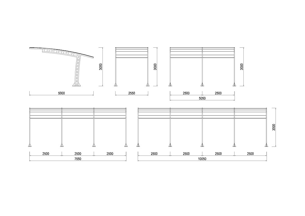 Přístřešek na automobil D-AT01 je dostupný jako modulová řada v délkách 2550, 5050, 7550 a 10050 mm, větší délky pak v modulech po 2500 mm.