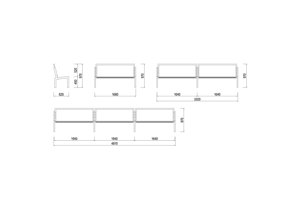 Rám lavičky je připevněn k podkladu pomocí kotevních prvků zapuštěných v betonovém základu. Všechny hliníkové části jsou pokryty polyesterovým práškem.